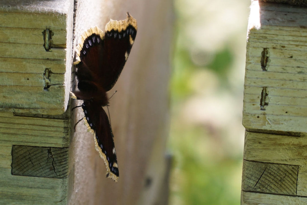 Trauermantel (Nymphalis antiopa) an einem Bienenstock