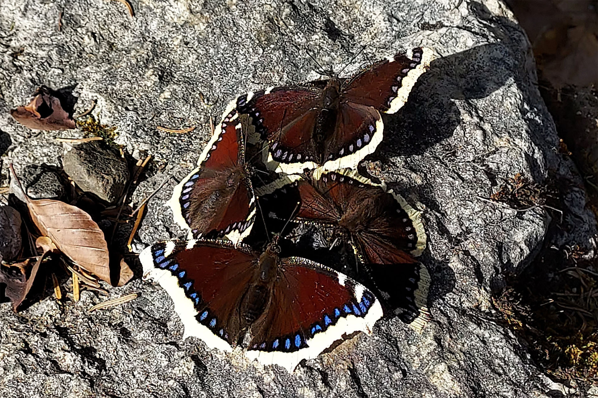 Carsten Bischoff entdeckte diese vier wahrscheinlich an Tierkot saugenden Trauermäntel (Nymphalis antiopa). Sämtliche Falter sind nahezu unversehrt aus der Überwinterung hervorgegangen.